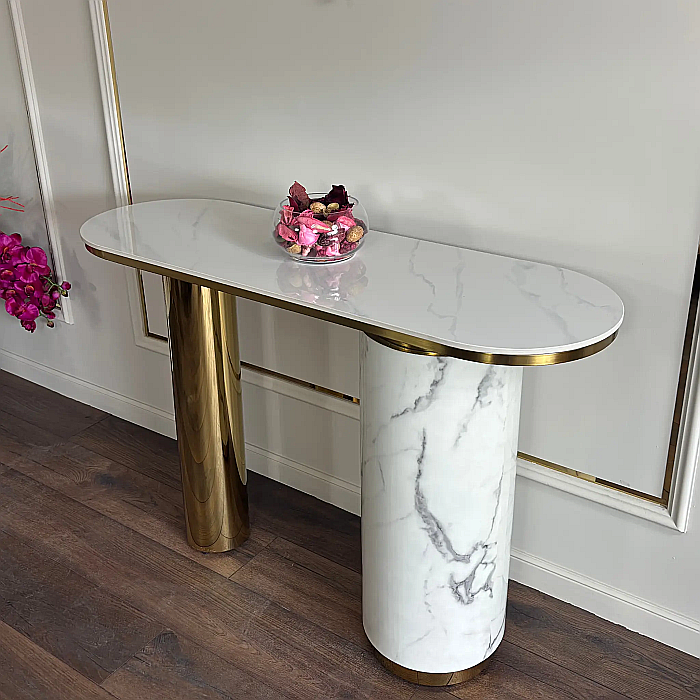 Consola Marble Glow combină eleganța blaturilor compozite cu aspect de marmură cu rafinamentul inoxului auriu, rezultând o piesă modernă și luminoasă, ideală pentru holuri, livinguri sau spații de expunere. Designul cilindric și proporțiile echilibrate îi oferă o prezență decorativă puternică, fără să încarce vizual încăperea.