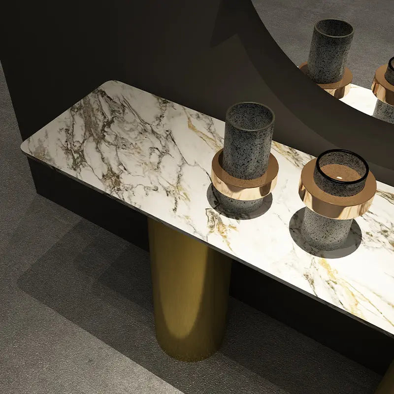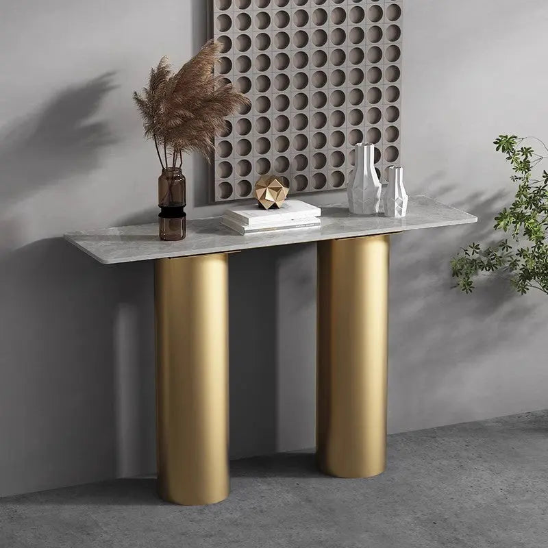 Consola Pillar este o piesă elegantă și echilibrată, cu un design inspirat din arhitectura clasică reinterpretată în stil modern. Cele două coloane cilindrice din inox auriu susțin blatul din compozit cu aspect marmorat, formând o compoziție minimalistă, aerisită și sofisticată — perfectă pentru interioare actuale.