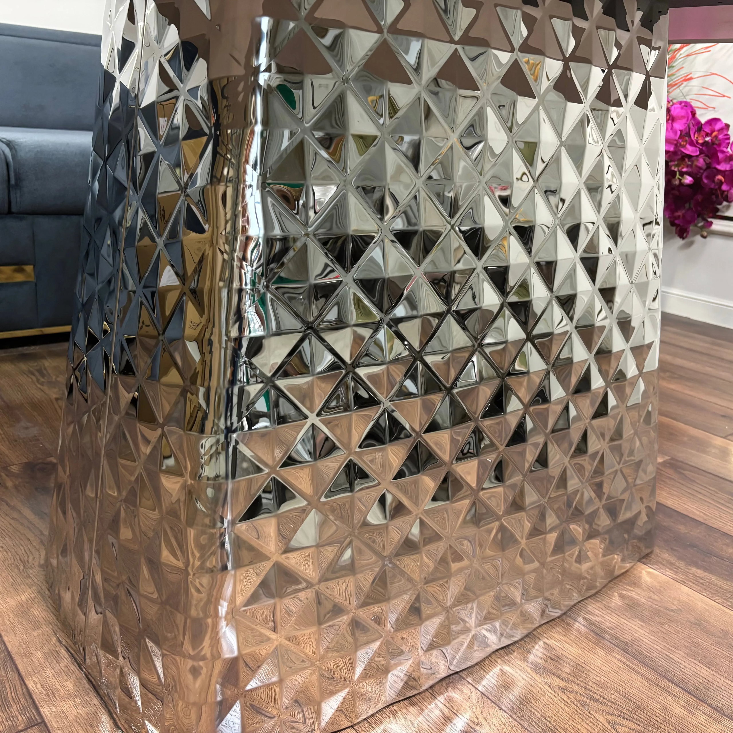 • Picior central din inox texturat, cu efect geometric tridimensional, pentru un look premium și stabilitate excelentă.