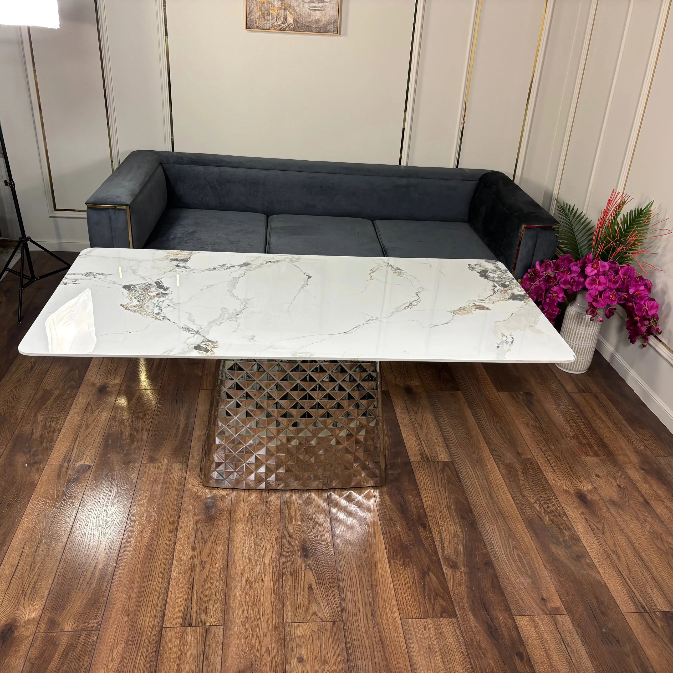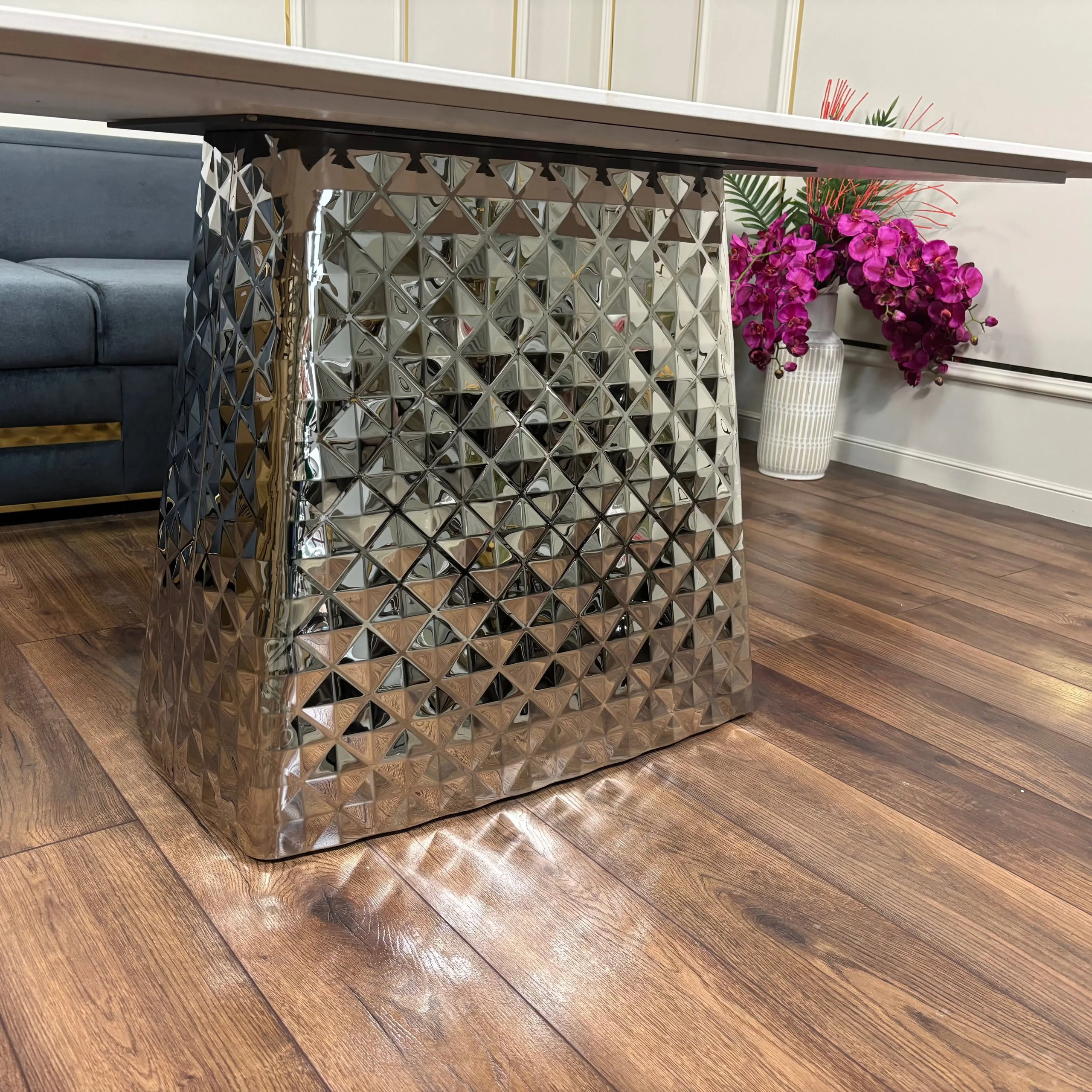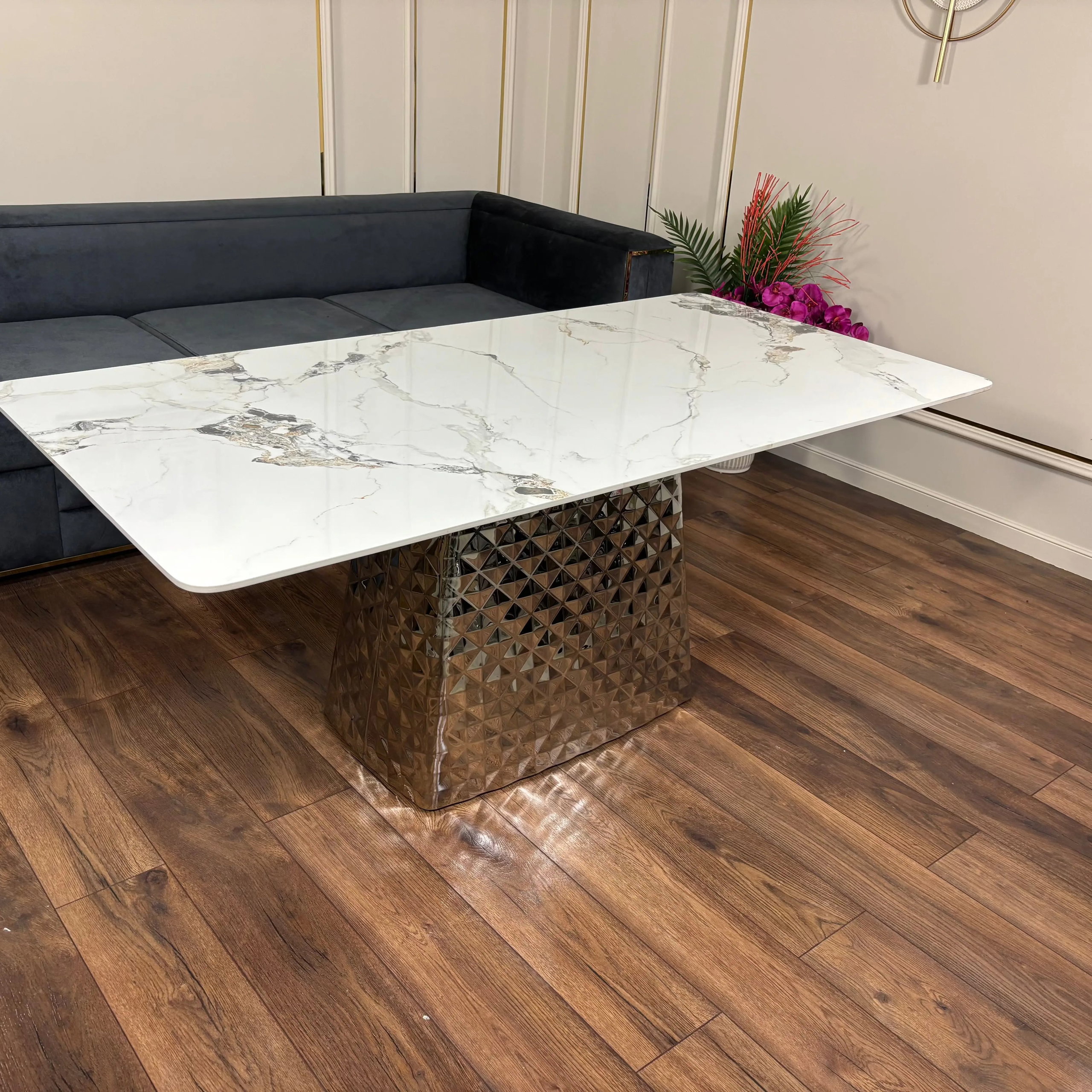 Masa dining Kallisto se remarcă prin blatul compozit cu aspect de marmură și baza sculpturală din inox texturat. Designul tridimensional al piciorului îi oferă un aspect modern și luxos, transformând masa într-o piesă centrală într-un dining contemporan.