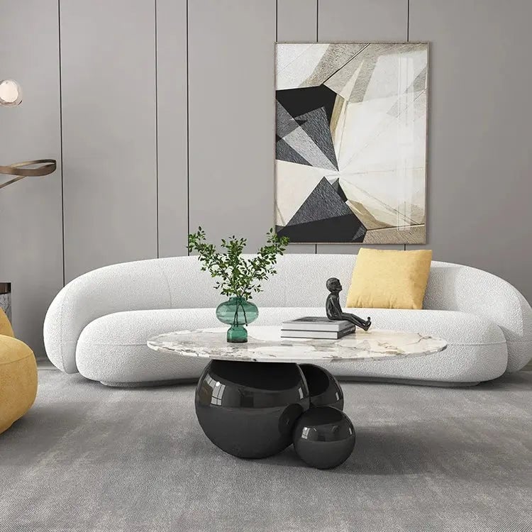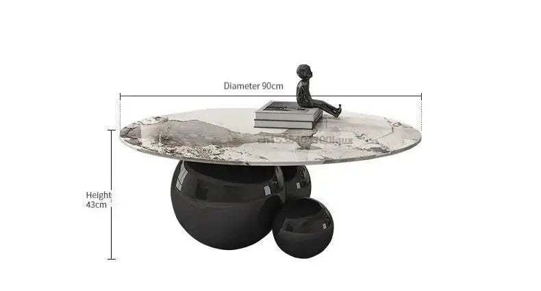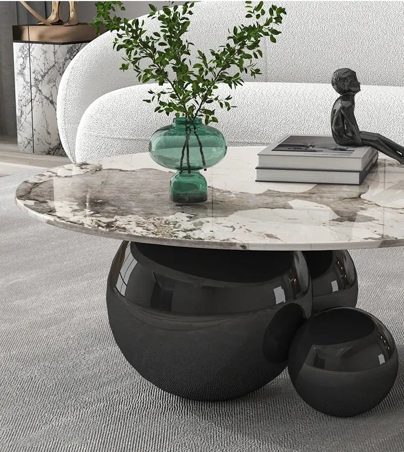 Măsuța Gala impresionează prin forma sculpturală și combinația dintre blatul din piatră sinterizată și baza decorativă tip sferă. Designul său modern și detaliile lucioase o transformă într-o piesă centrală sofisticată pentru orice living.
