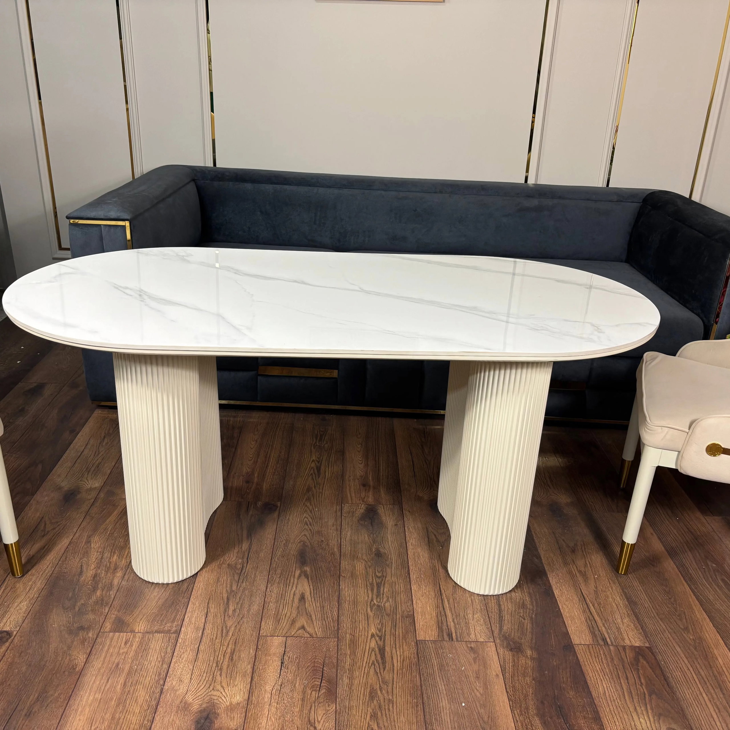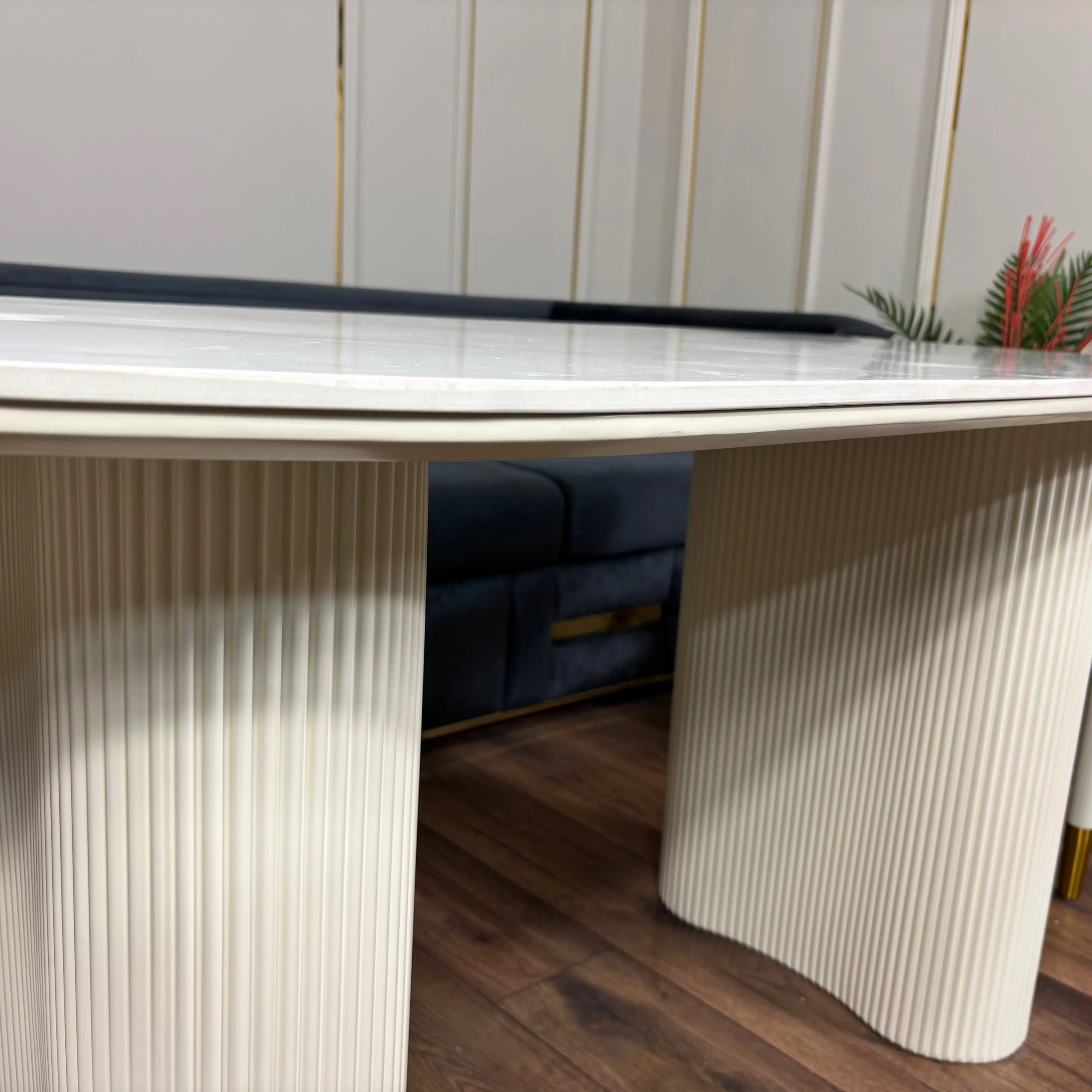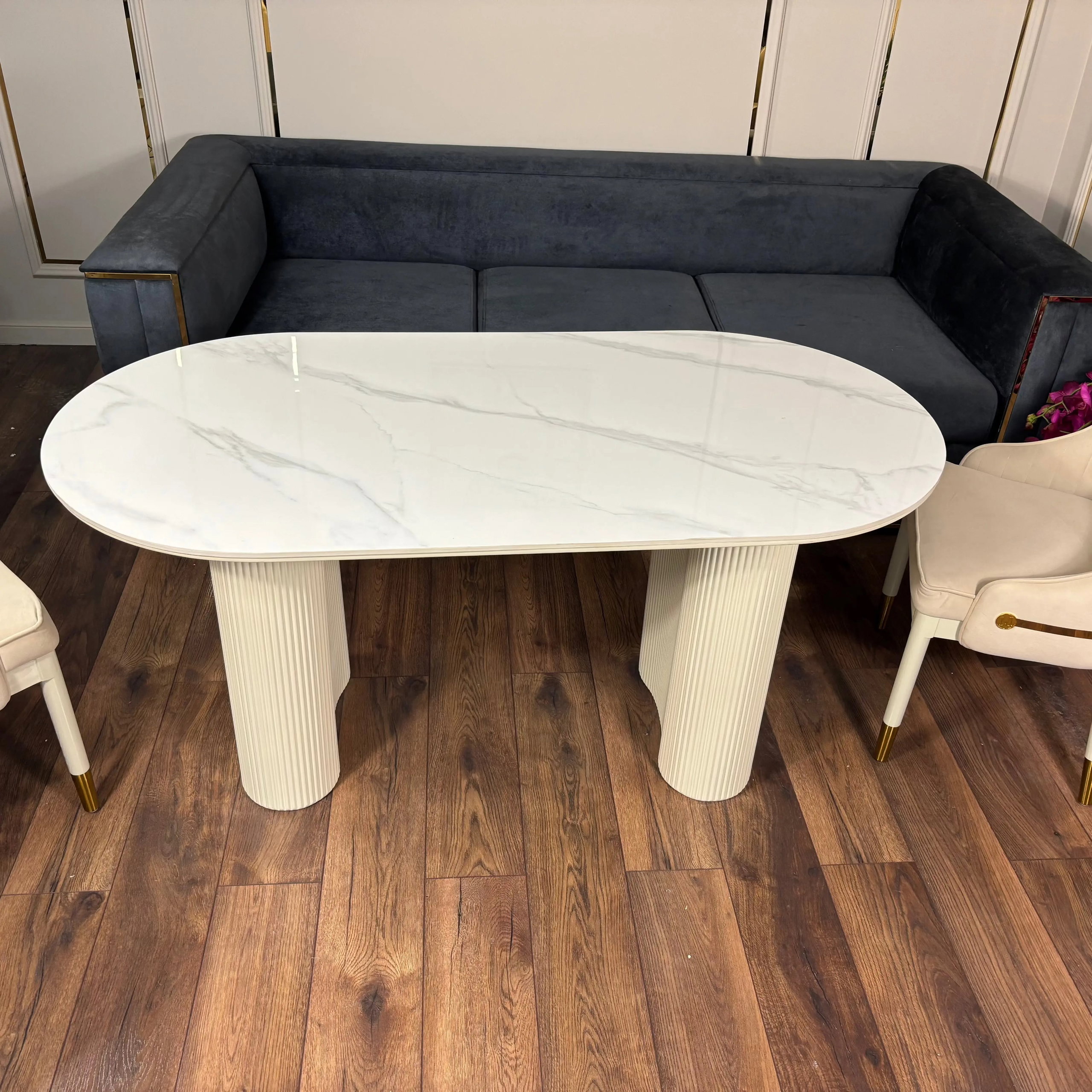 Masa dining Althea este o piesă modernă și luminoasă, creată pentru interioare elegante. Blatul compozit cu aspect de marmură se combină perfect cu picioarele din MDF vopsit, sculptate cu detalii verticale, oferind un aspect rafinat și contemporan.