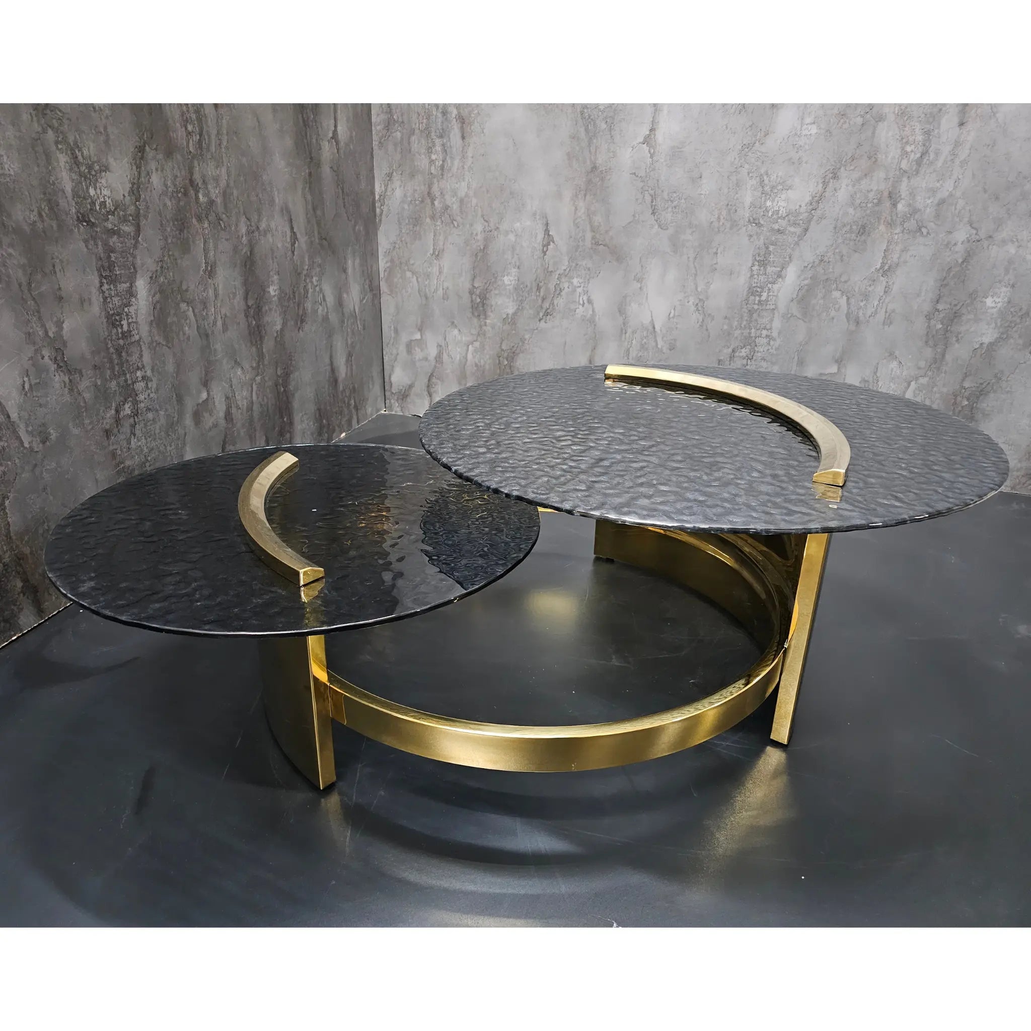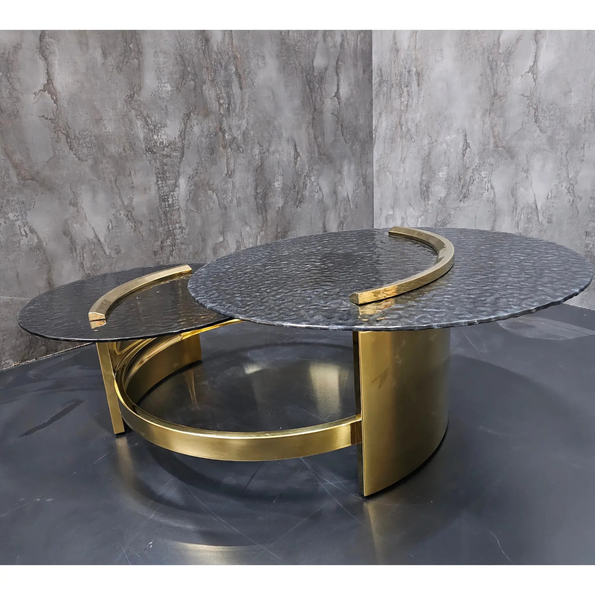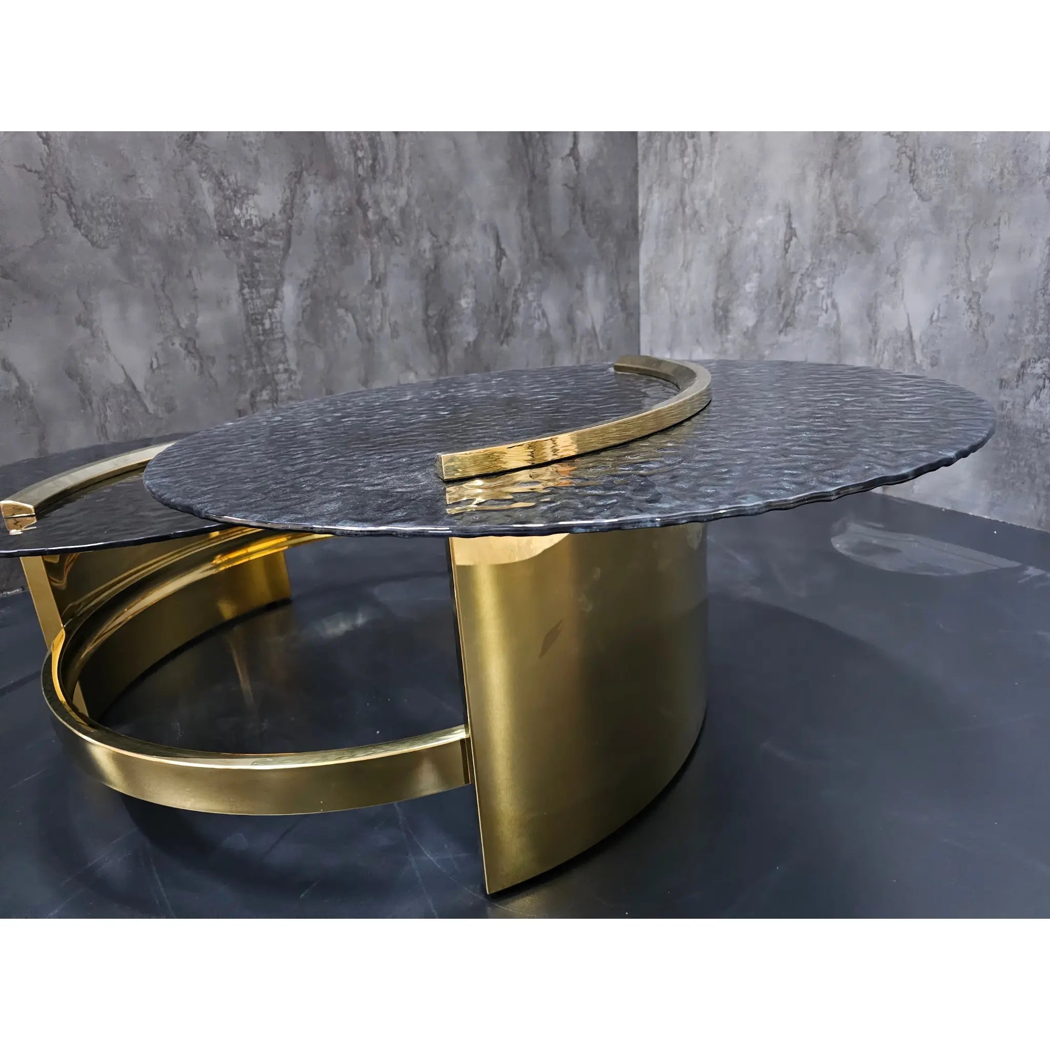 Măsuța Infinity oferă un efect vizual spectaculos datorită contrastului dintre textura sticlei și strălucirea inoxului auriu. Este o piesă de accent ideală pentru orice living luxos, transformând spațiul într-un decor modern și sofisticat.