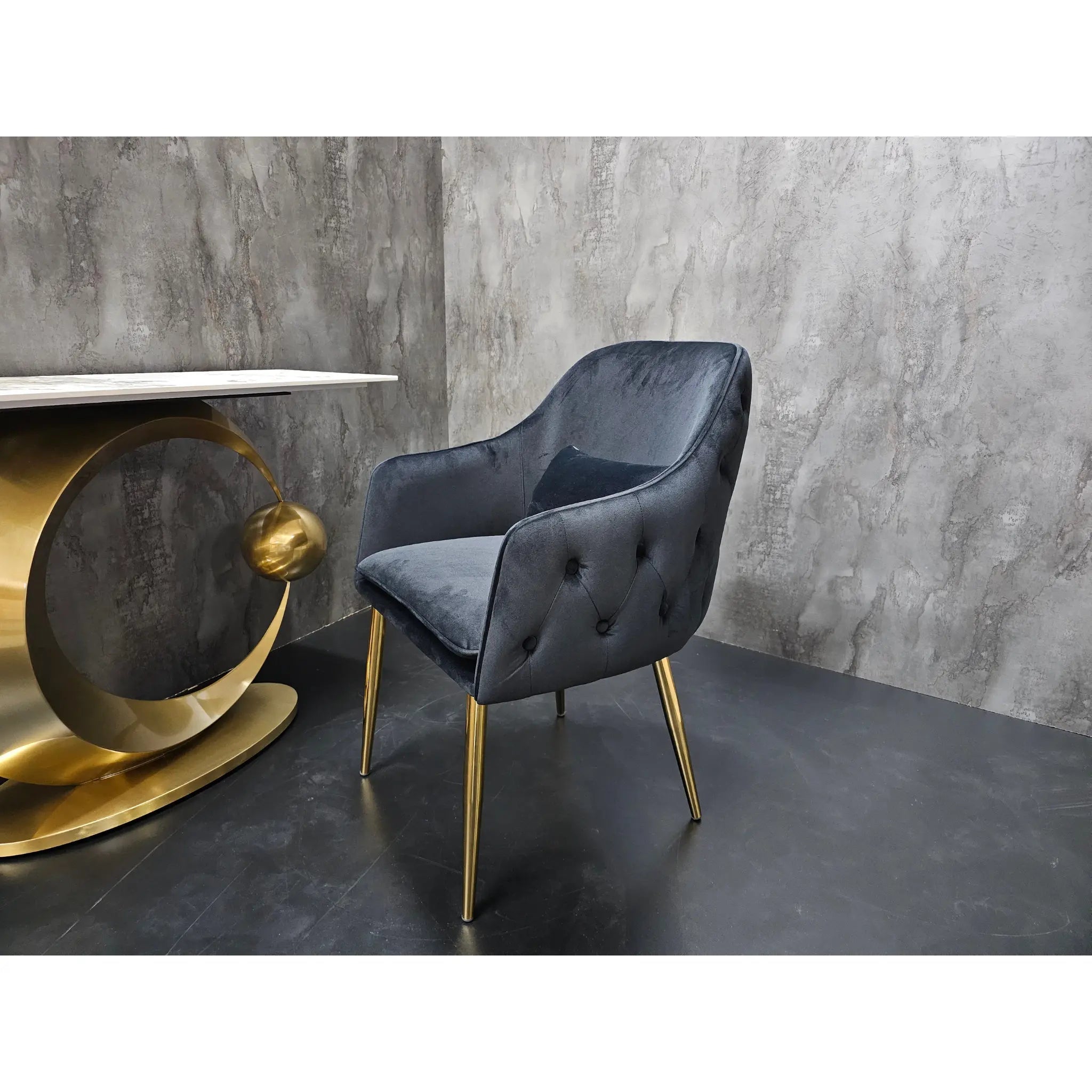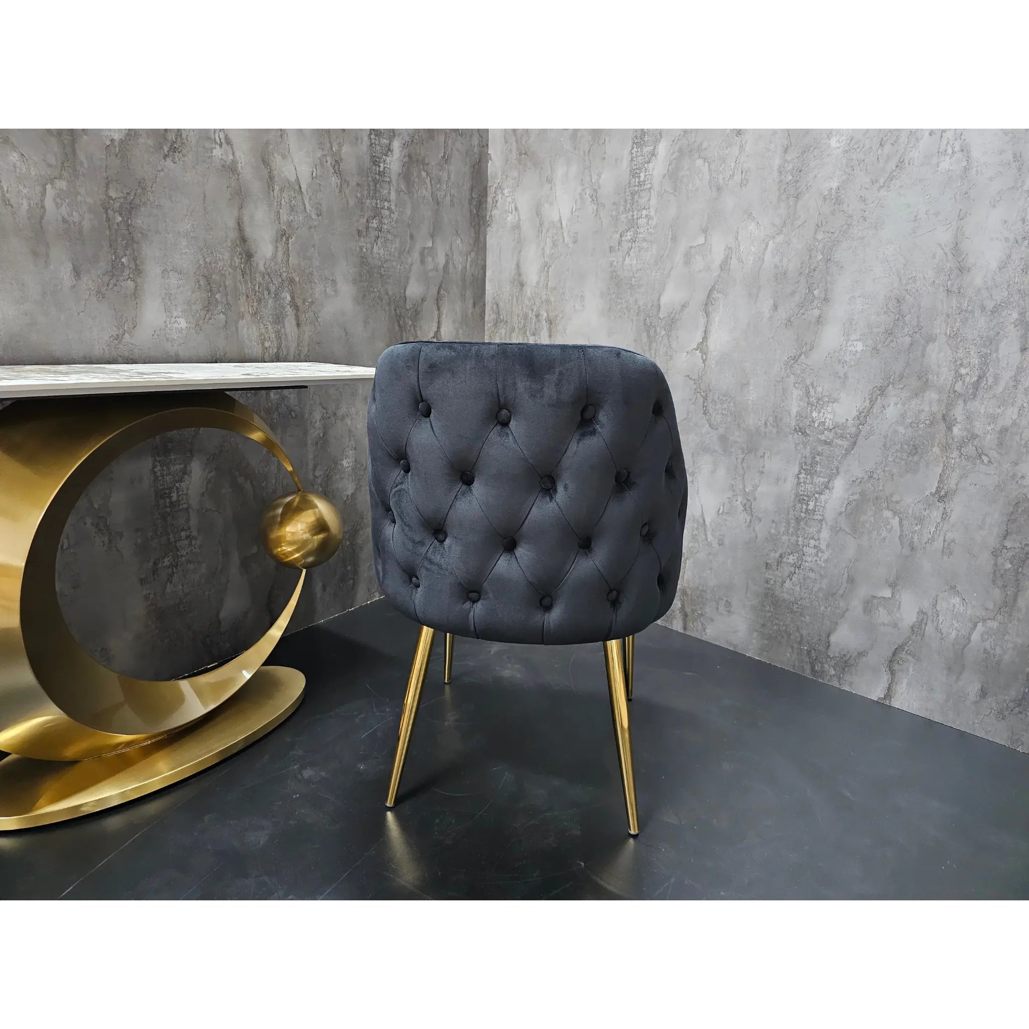 Scaunul dining Catania aduce un aer sofisticat în orice zonă de dining, combinând confortul tapițeriei din catifea neagră cu eleganța picioarelor metalice aurii. Designul său modern, cu forme rotunjite și detalii rafinate, îl transformă într-o piesă statement pentru interioare contemporane, glamour sau lounge.