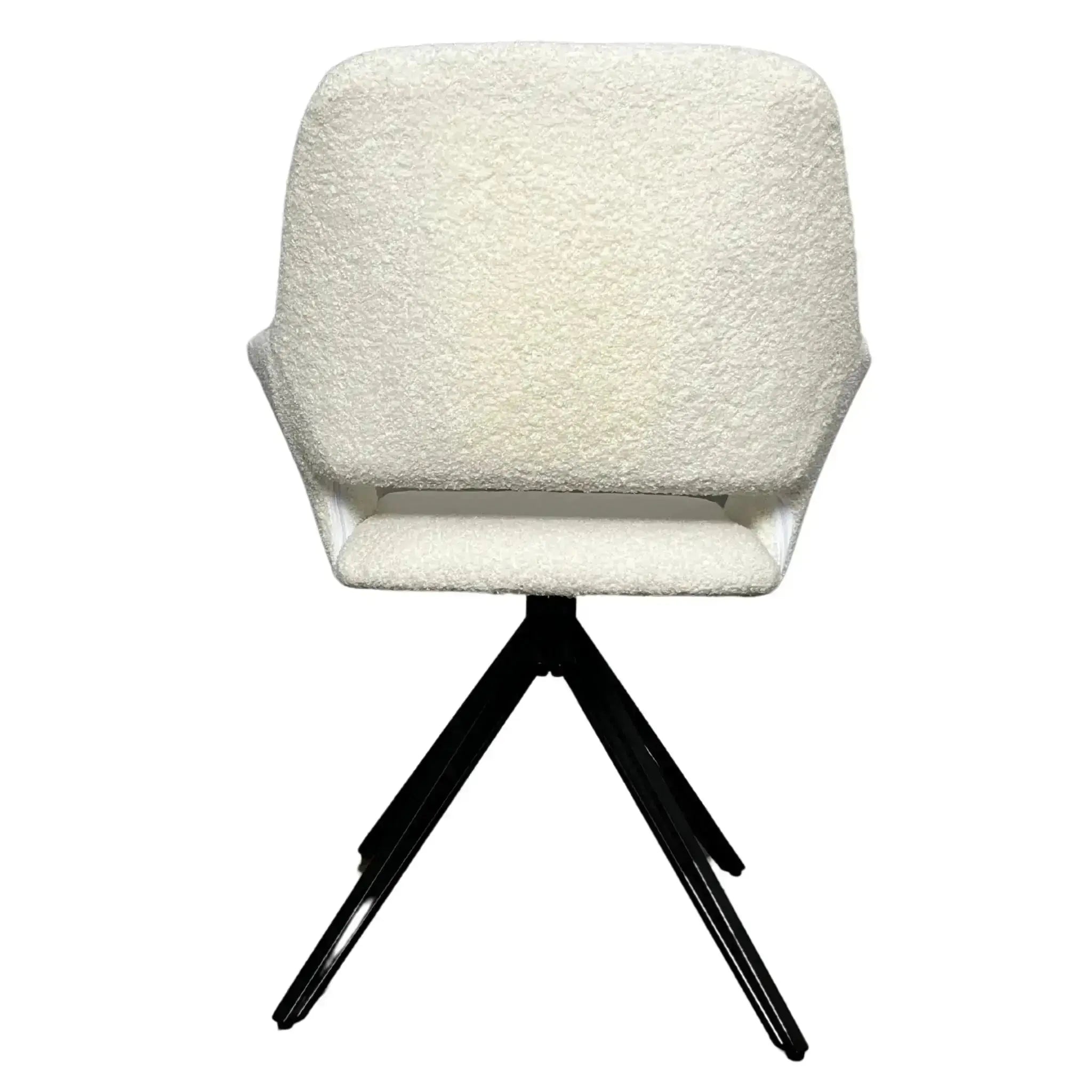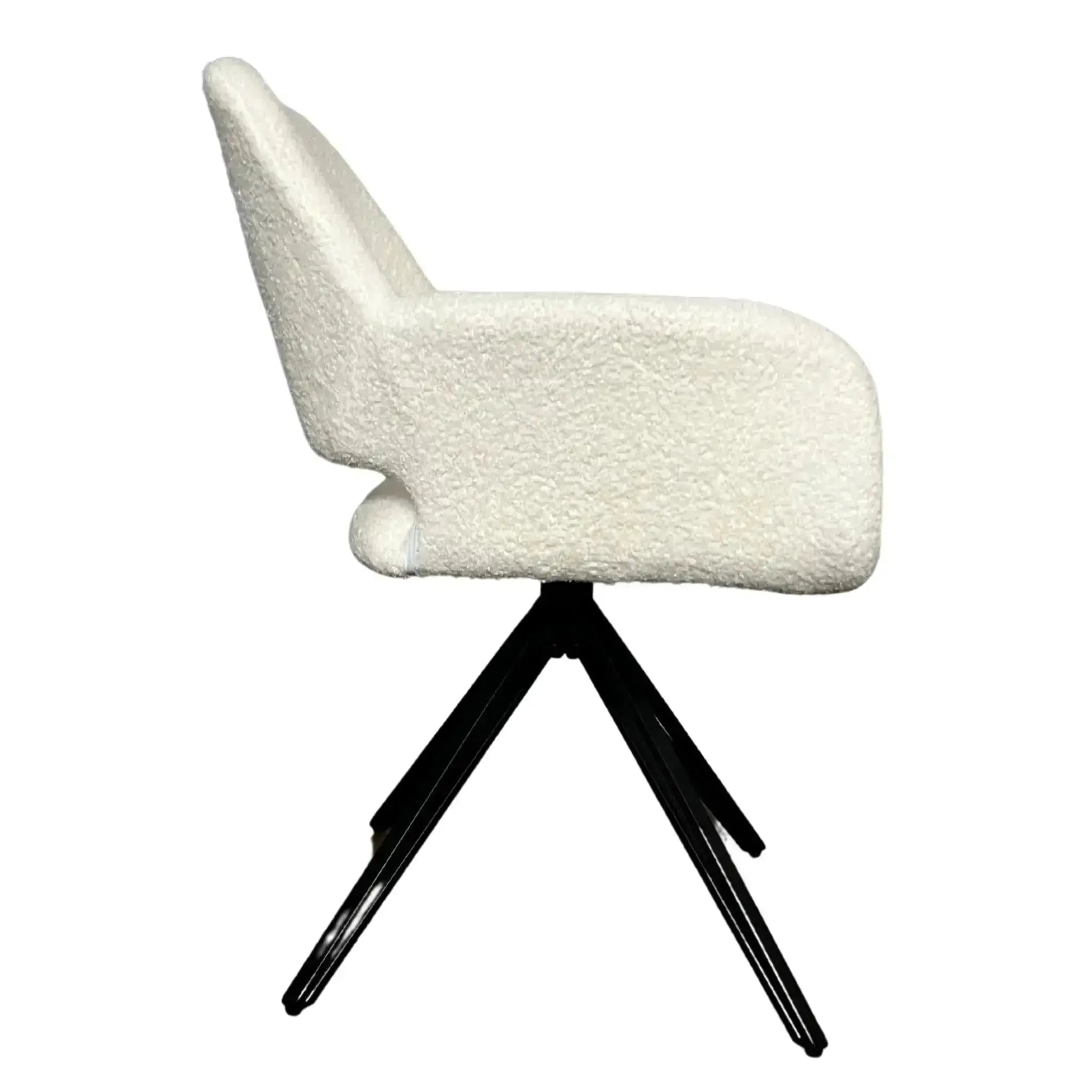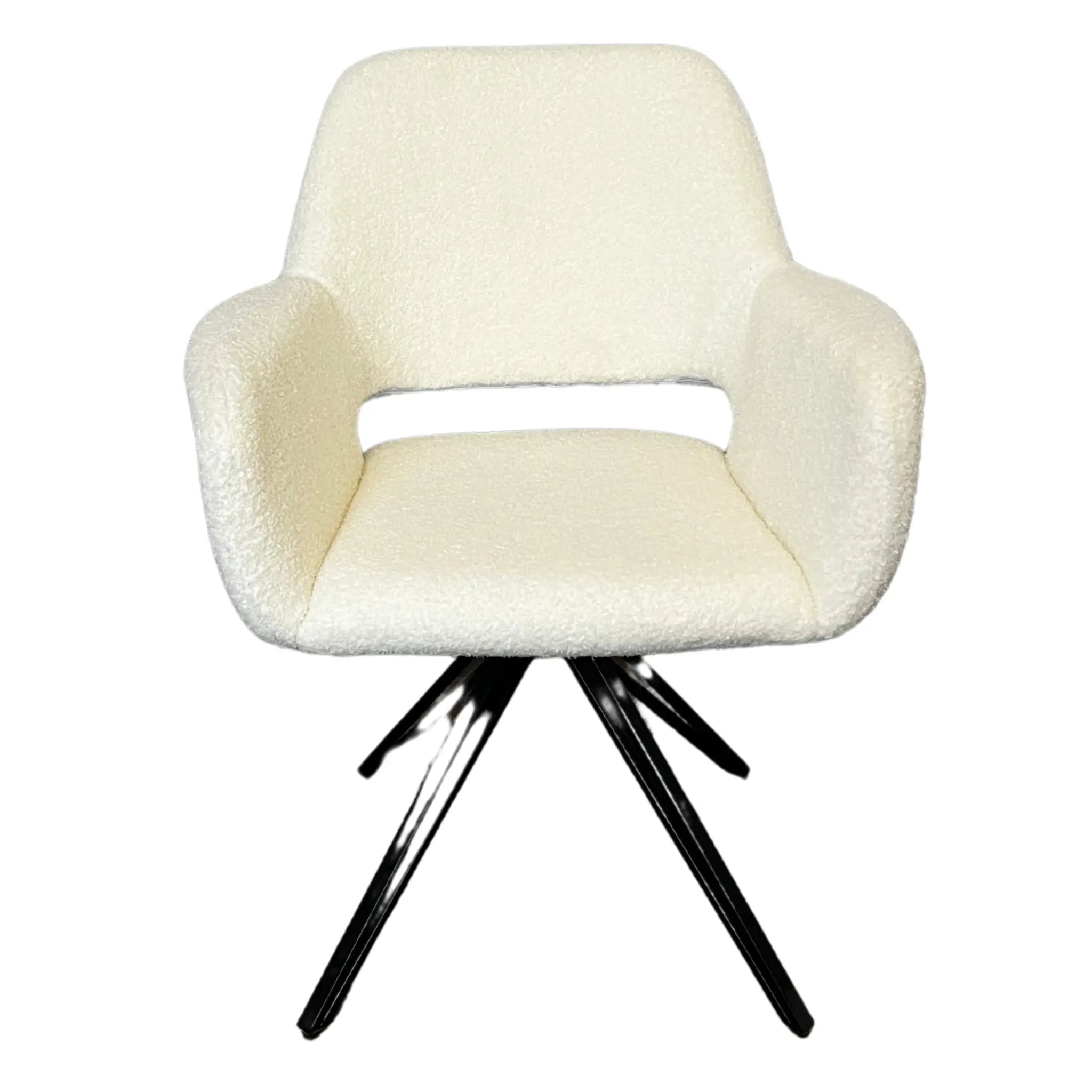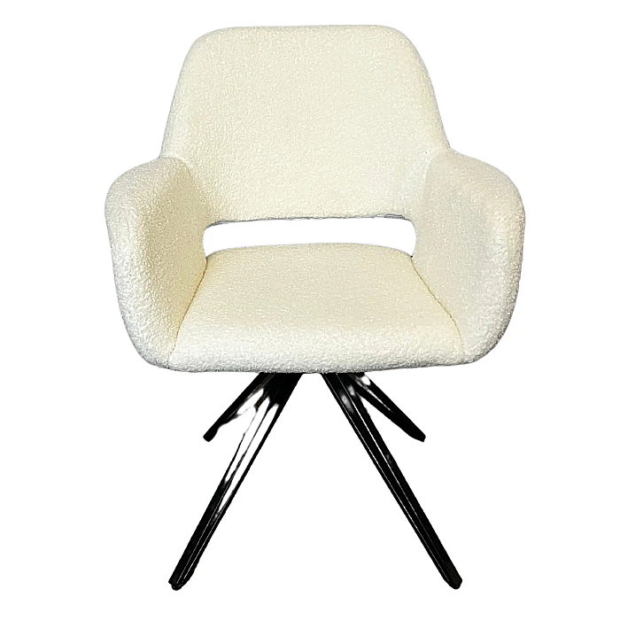 Scaunul dining Lira combină liniile moderne cu textura plăcută a tapițeriei albe, inspirată de catifeaua bouclé, oferind un look elegant și contemporan. Designul cu decupaj decorativ în spătar și brațe integrate aduce un plus de stil și ușurință vizuală, transformând Lira într-o piesă statement pentru spații luminoase și moderne.