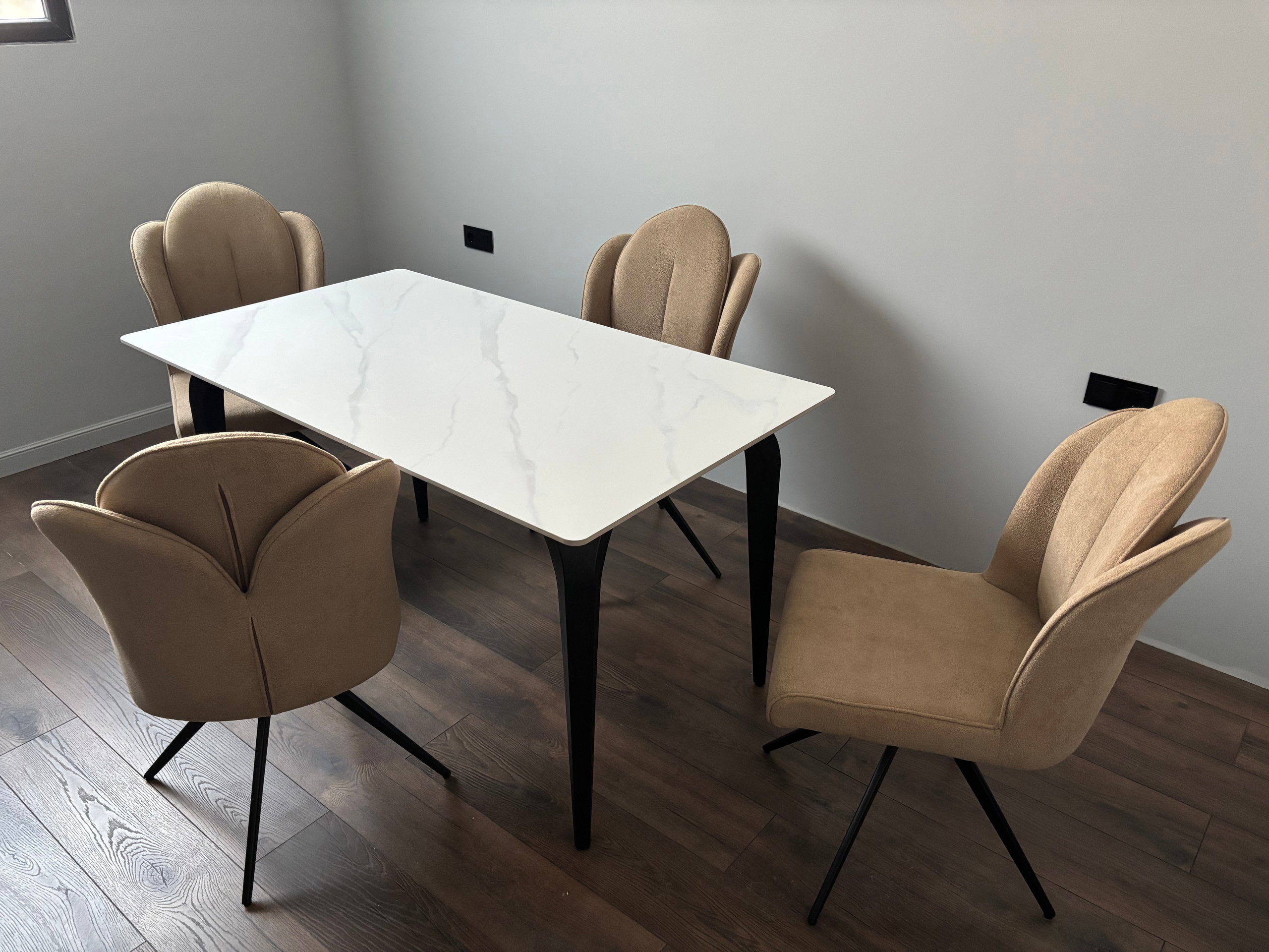 Scaunele Aruna sunt gândite pentru confort maxim, având o tapițerie premium din stofă într-o nuanță caldă de bej. Forma ergonomică și baza metalică rotativă permit o mobilitate ușoară, făcând din acest set o alegere ideală pentru orice sufragerie modernă.