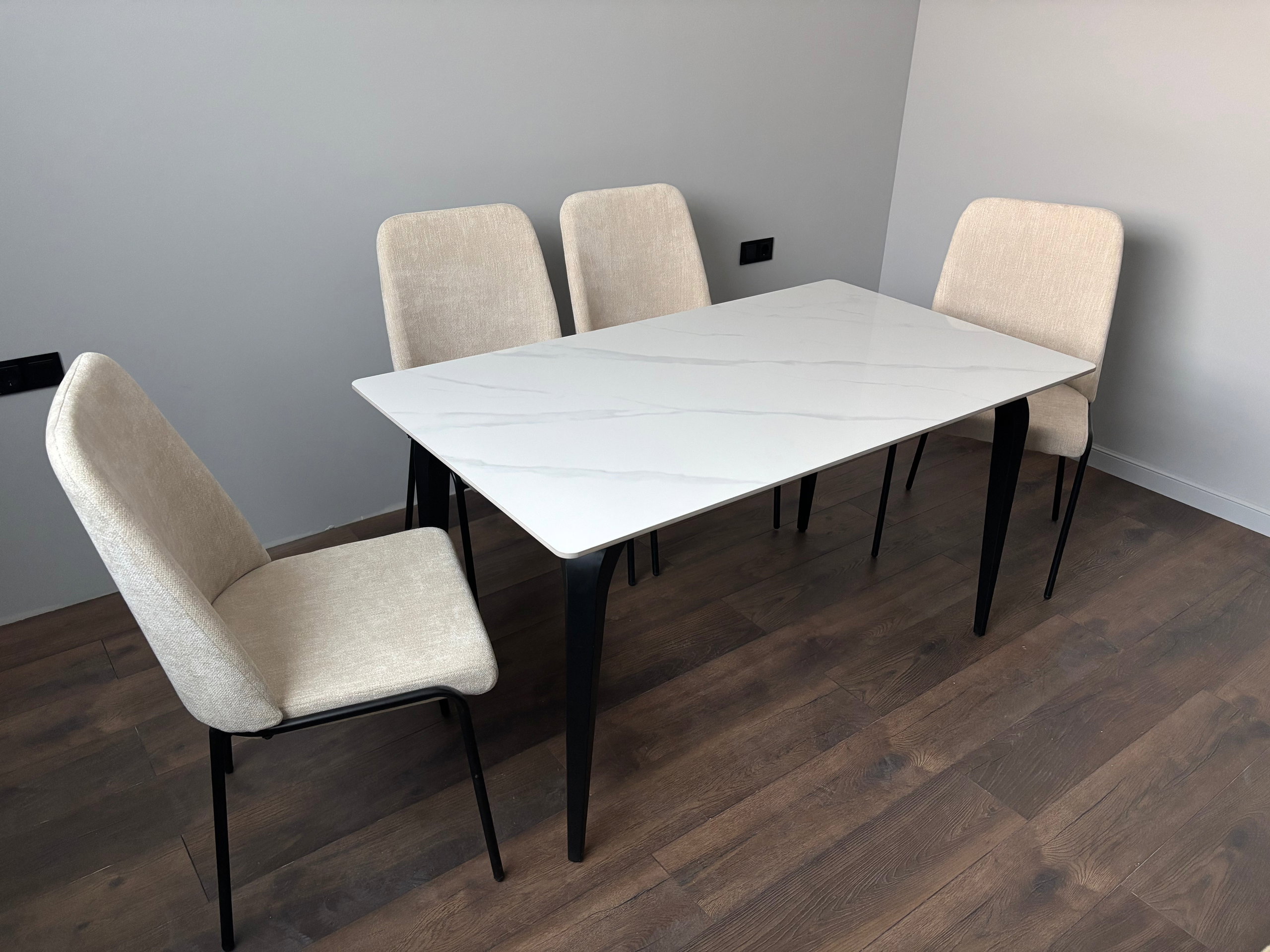 Masa are un blat din compozit cu aspect de marmură, disponibil atât în varianta neagră, cât și în varianta albă, fiind rezistentă și ușor de întreținut. Picioarele metalice asigură stabilitate și completează estetica modernă a setului.