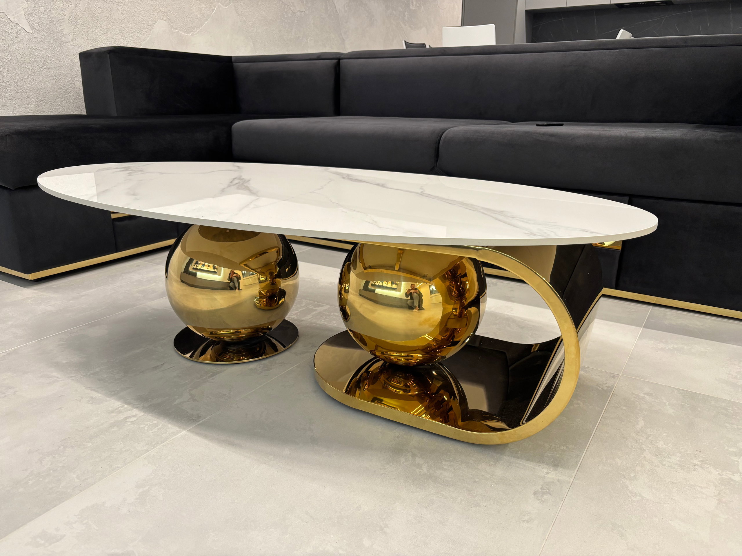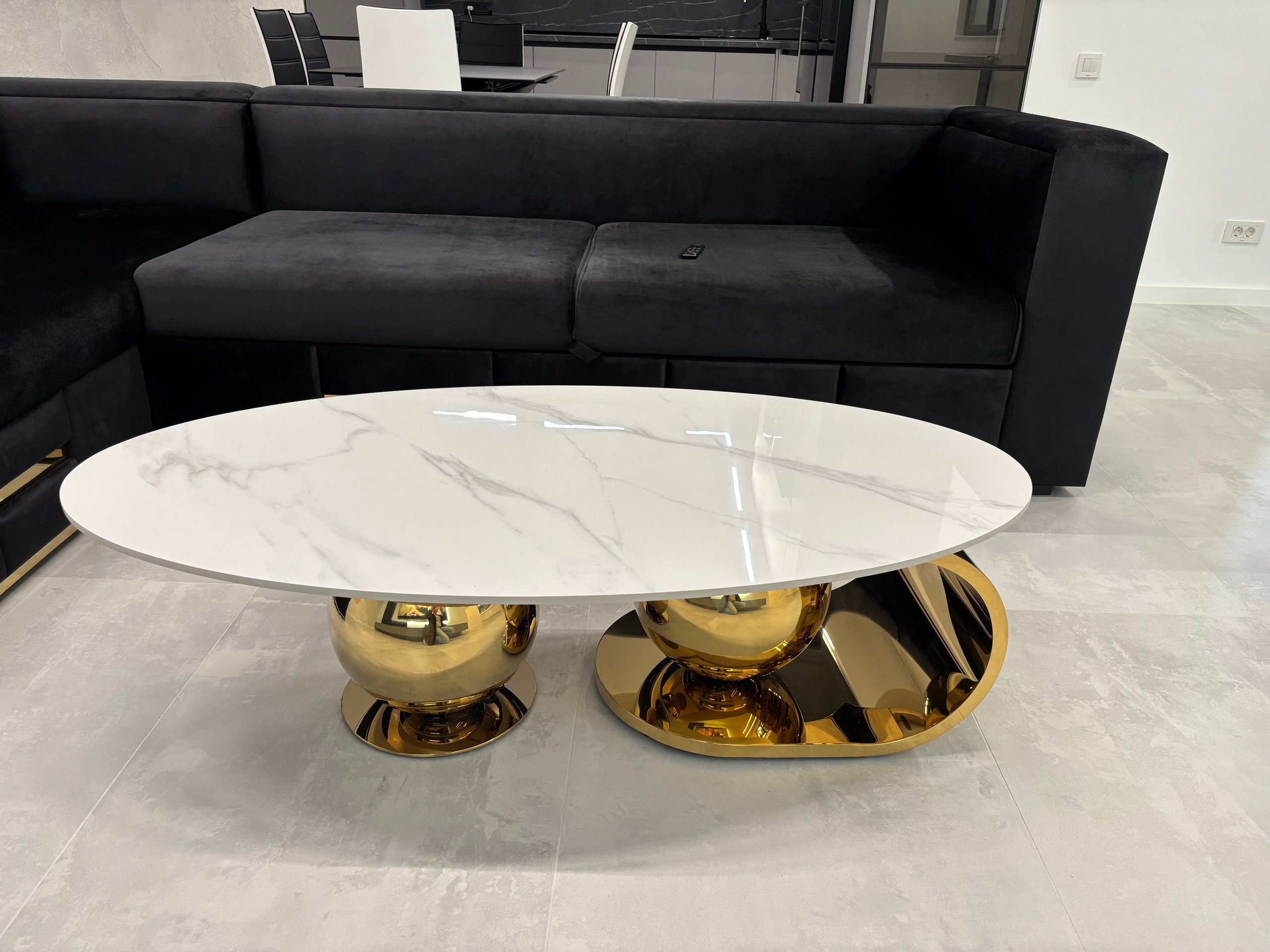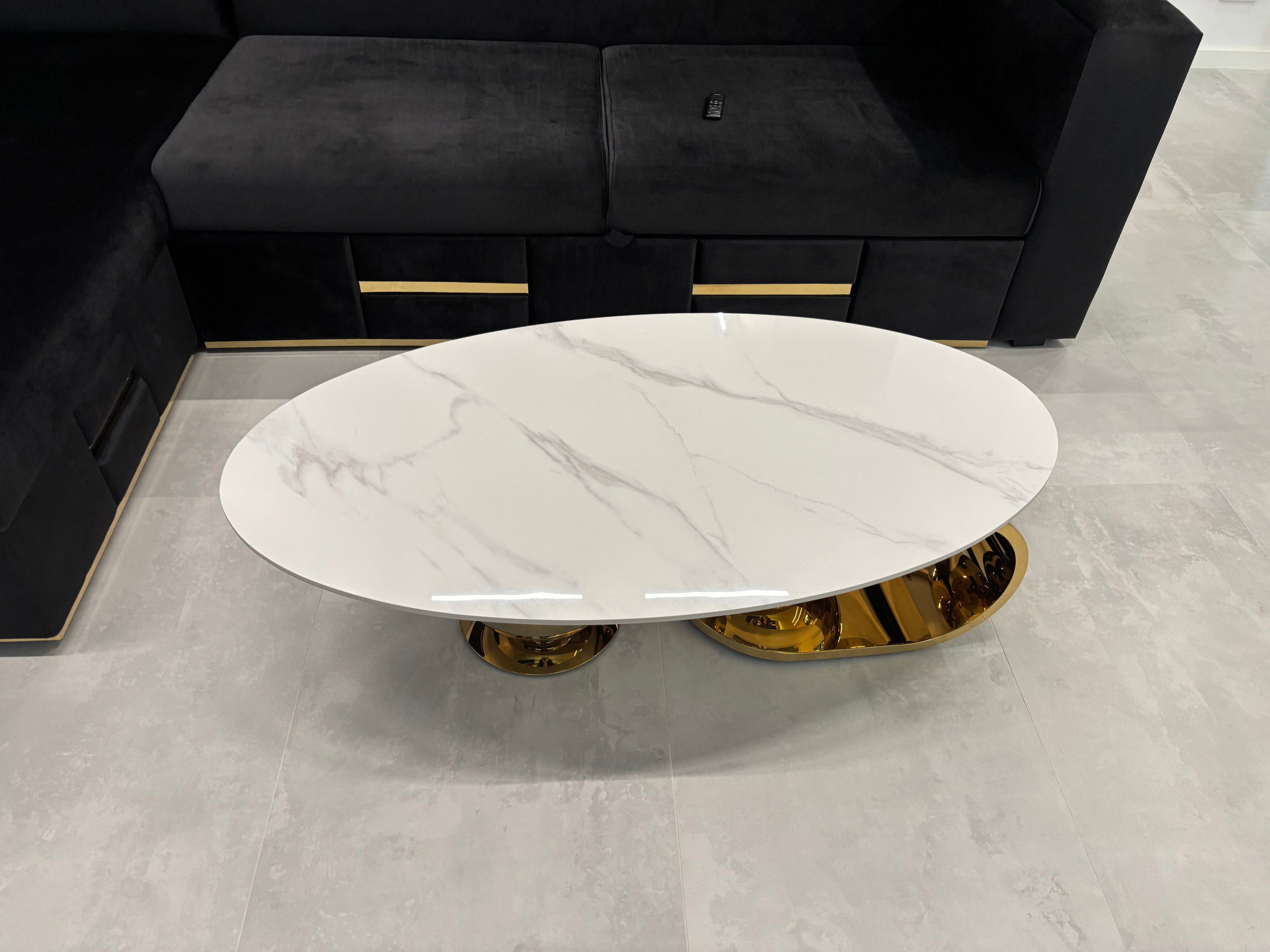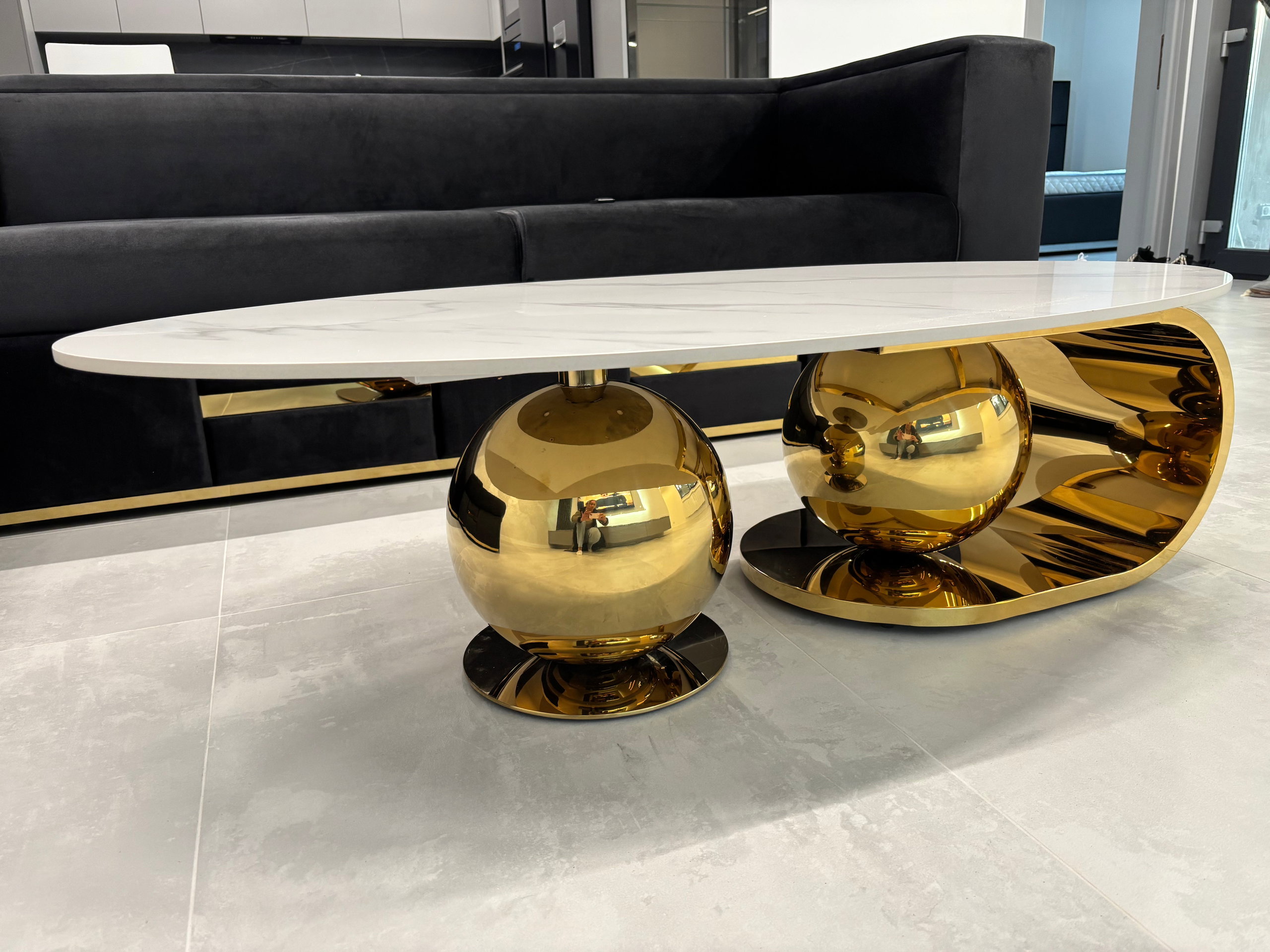 Setul de măsuțe Nova impresionează prin designul sculptural și combinația dintre formele fluide, blatul compozit cu aspect marmorat și elementele metalice aurii. Cele două piese se completează perfect, oferind un efect vizual rafinat și modern în orice living.