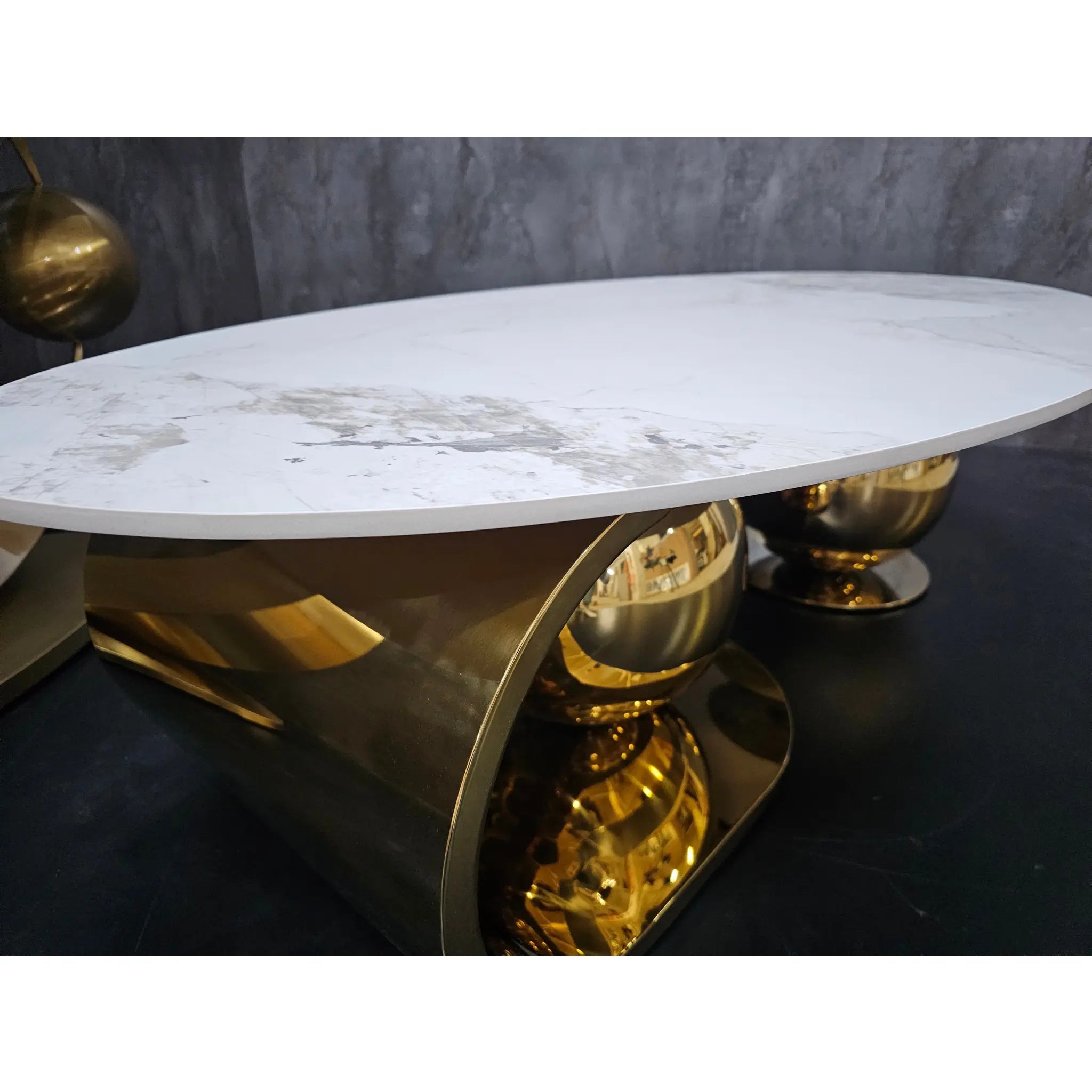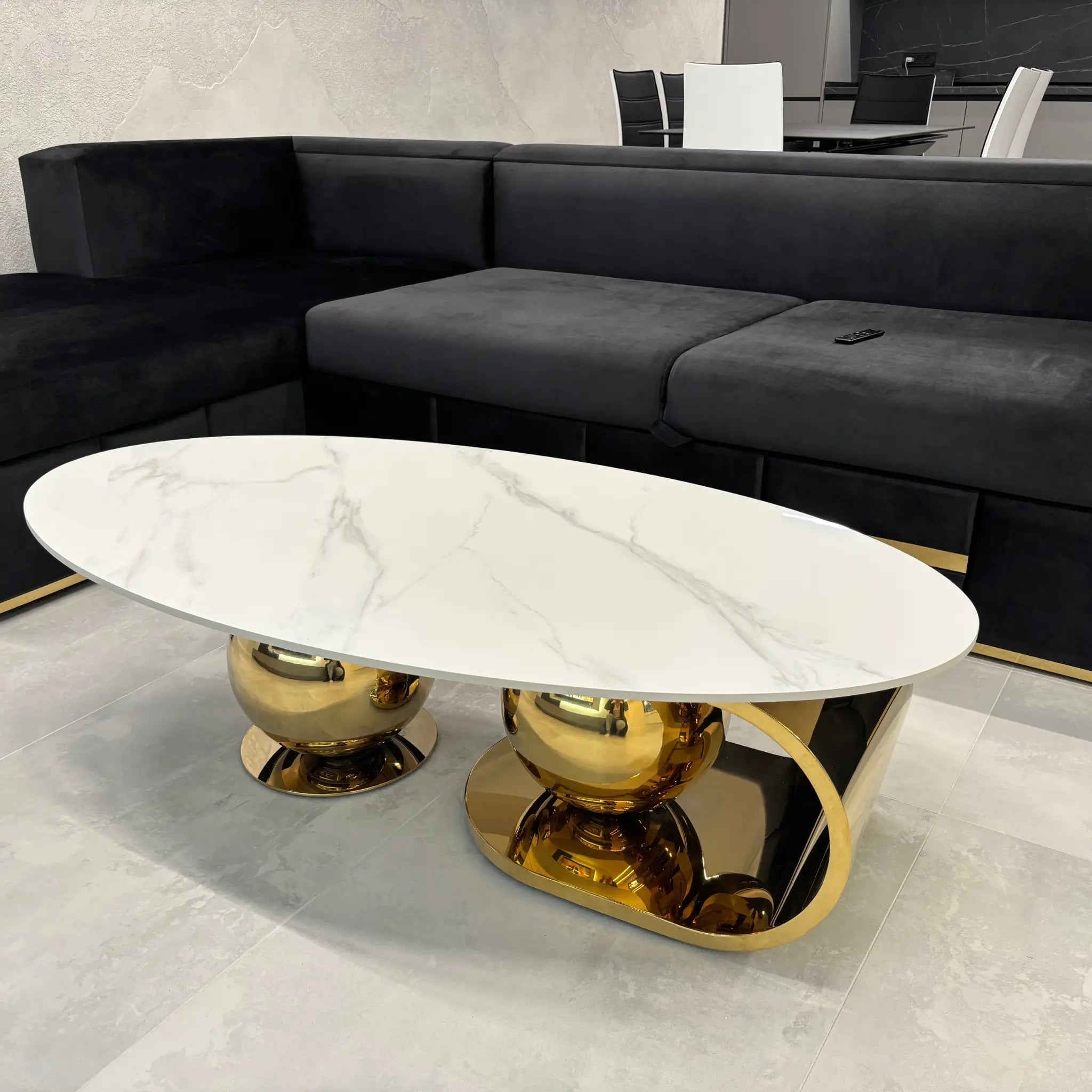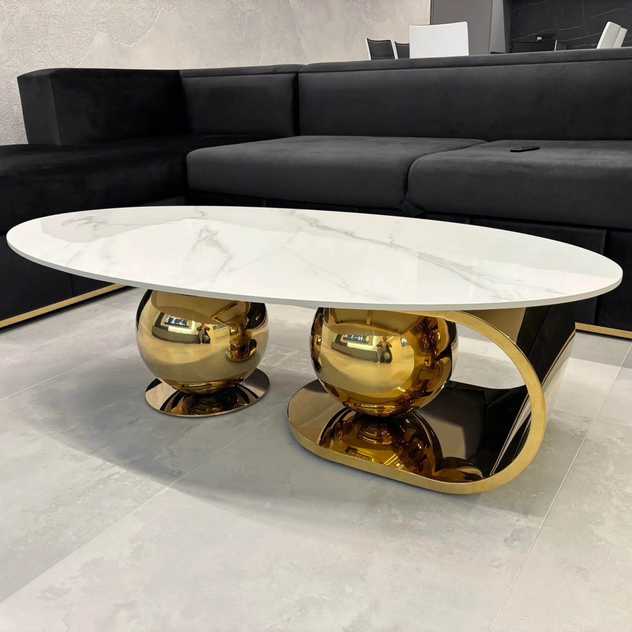 Setul de măsuțe Nova impresionează prin designul sculptural și combinația dintre formele fluide, blatul compozit cu aspect marmorat și elementele metalice aurii. Cele două piese se completează perfect, oferind un efect vizual rafinat și modern în orice living.
