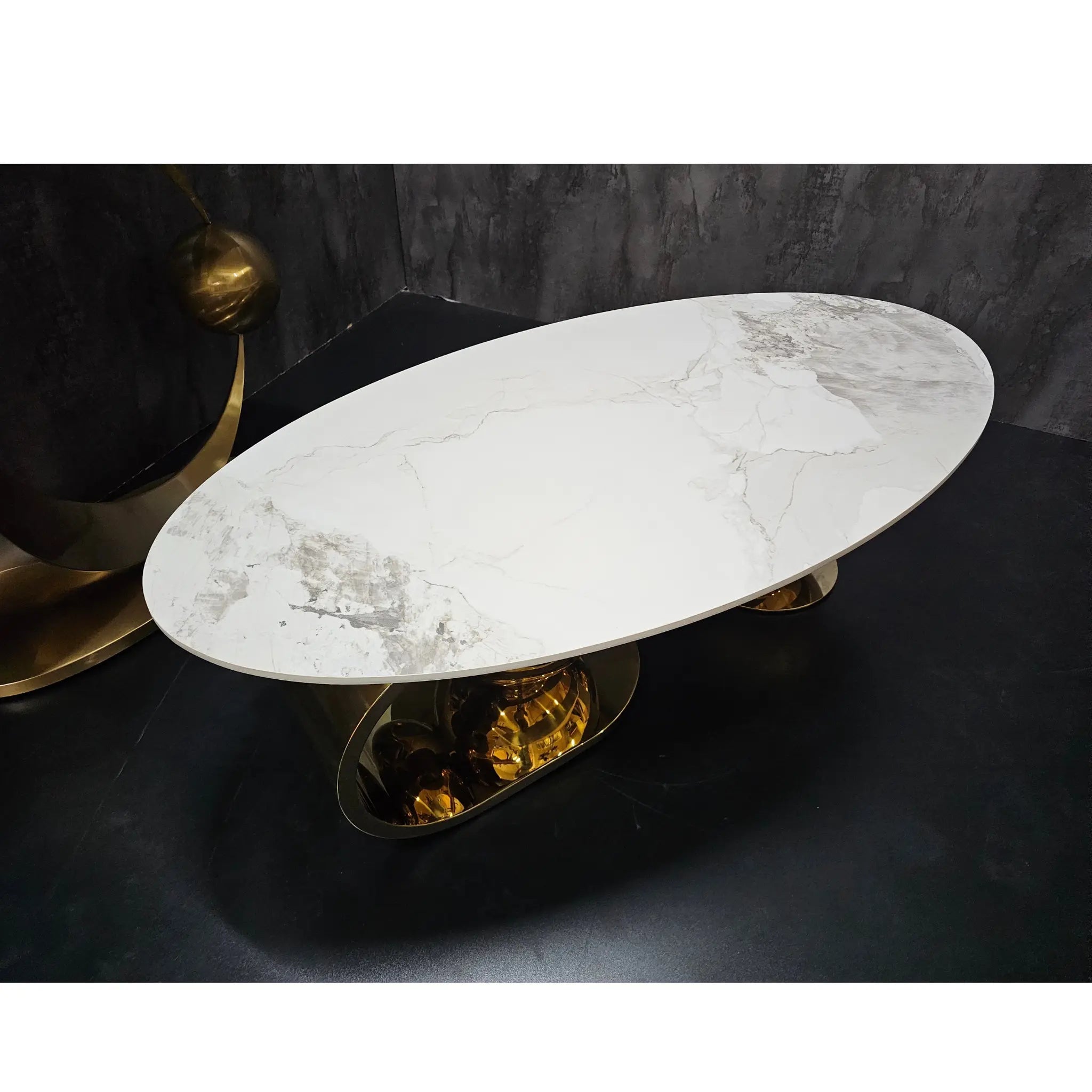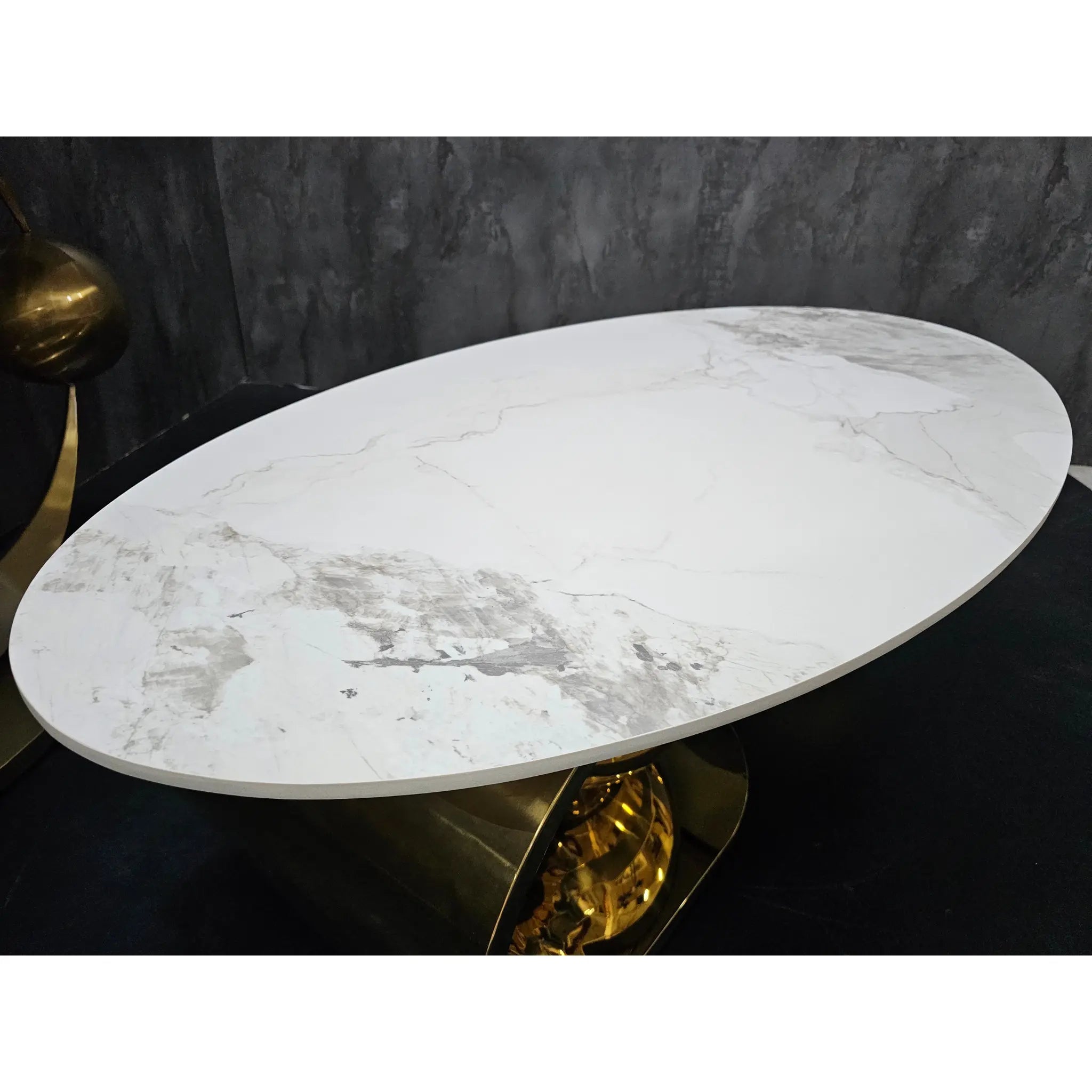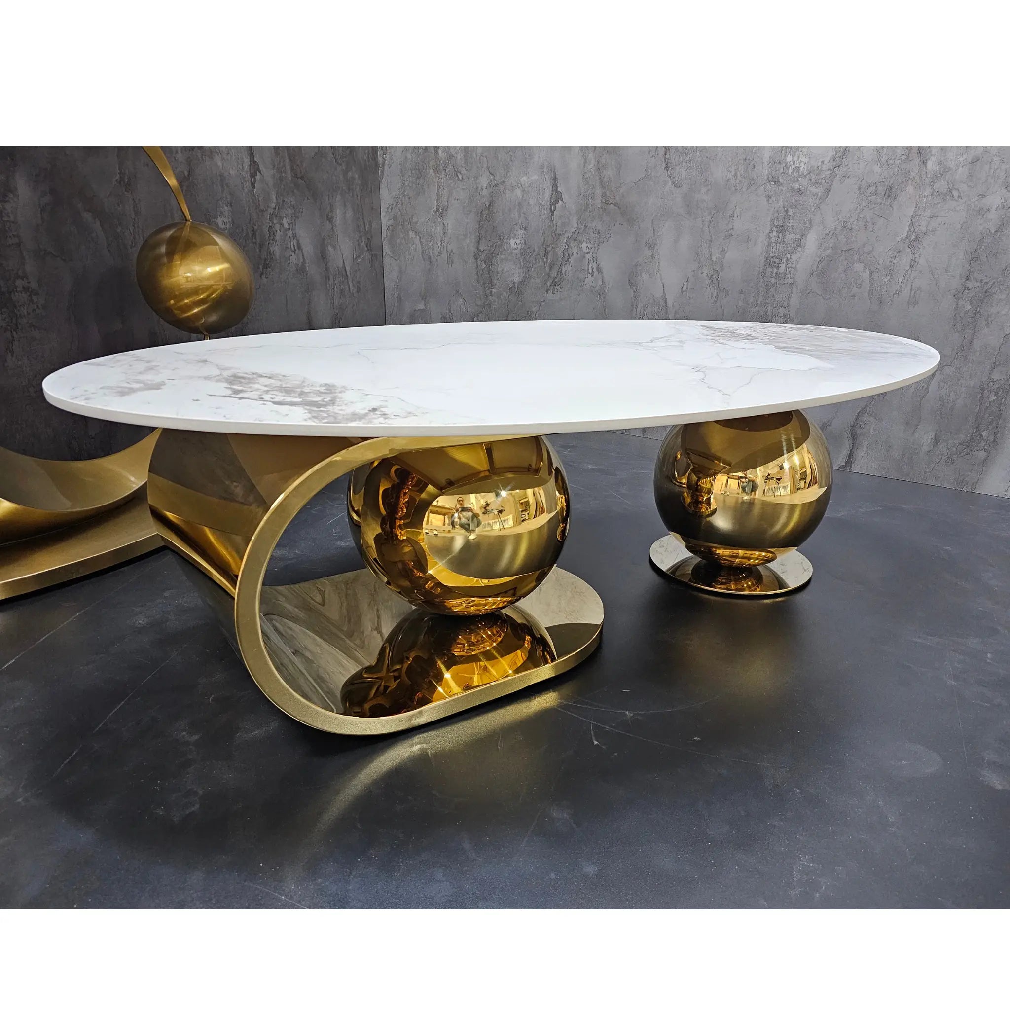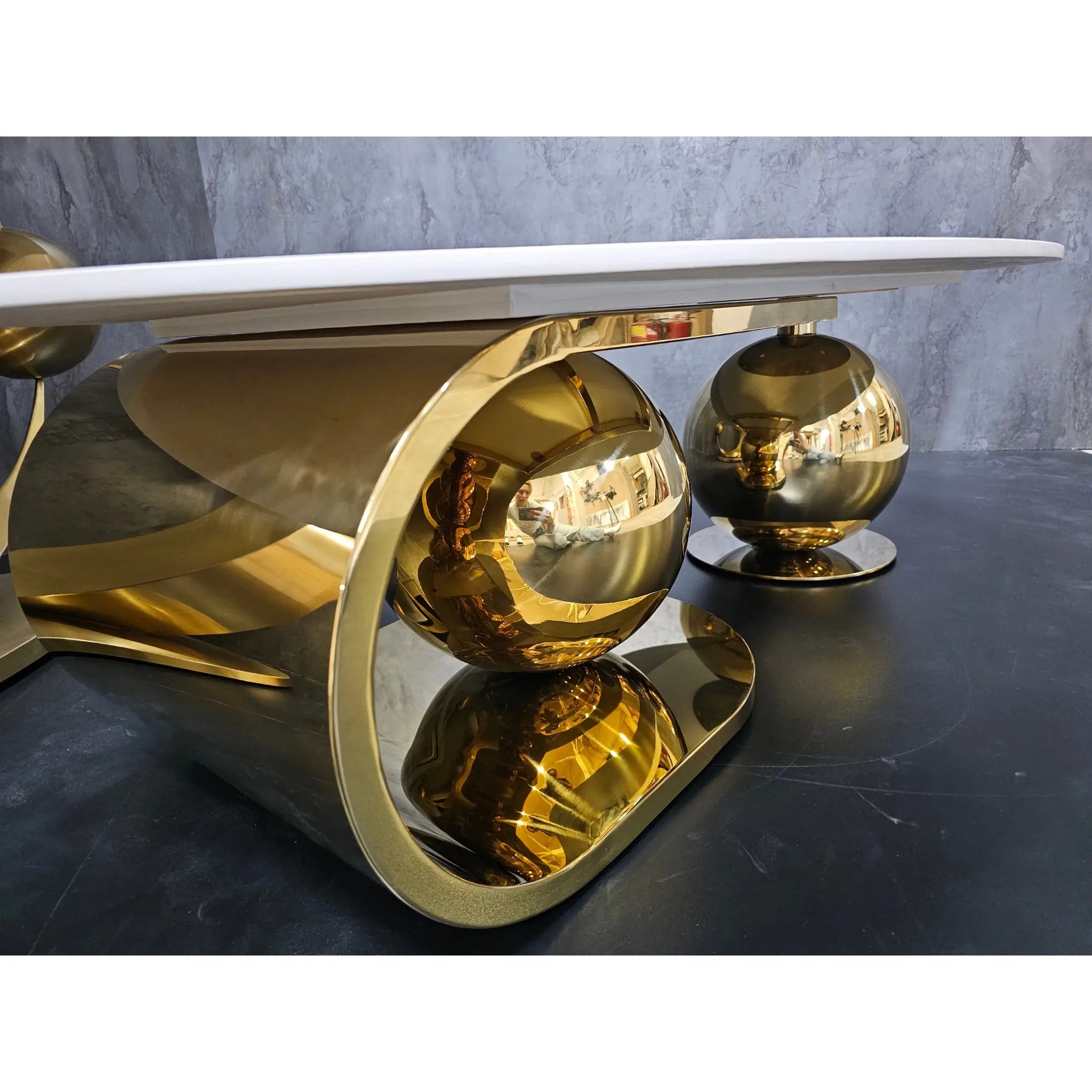 Setul de măsuțe Nova impresionează prin designul sculptural și combinația dintre formele fluide, blatul compozit cu aspect marmorat și elementele metalice aurii. Cele două piese se completează perfect, oferind un efect vizual rafinat și modern în orice living.
